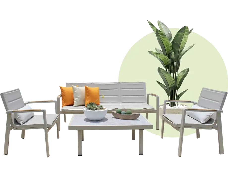 Nuestros muebles de exteriores son fabricados con láminas de aluminio calibre 2.0 y pintura de la más alta calidad con resistencia a ambientes exteriores, que garantiza que los marcos no se oxiden ni se corroen. La espuma es de alta densidad y las telas son teñidas en masa.