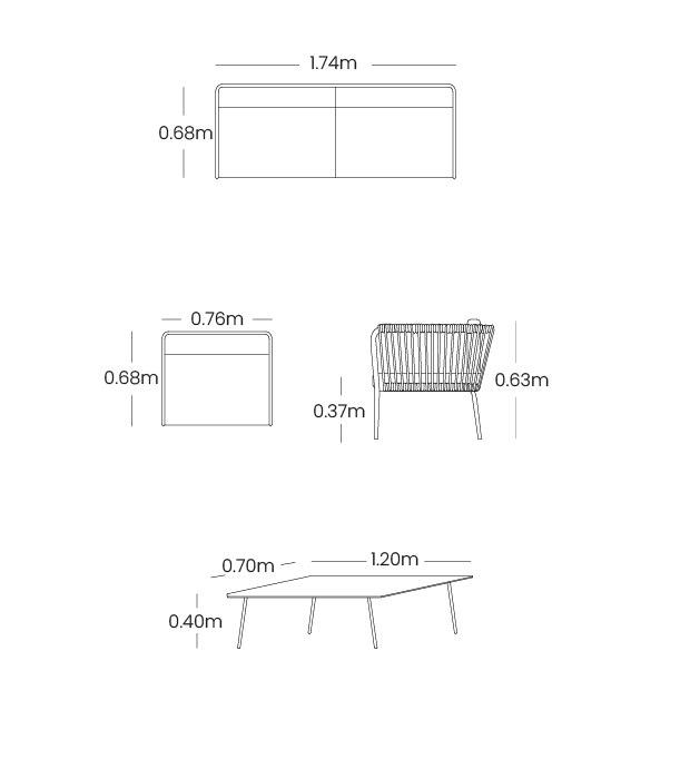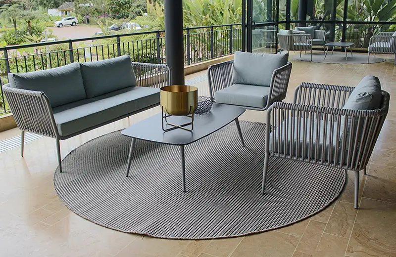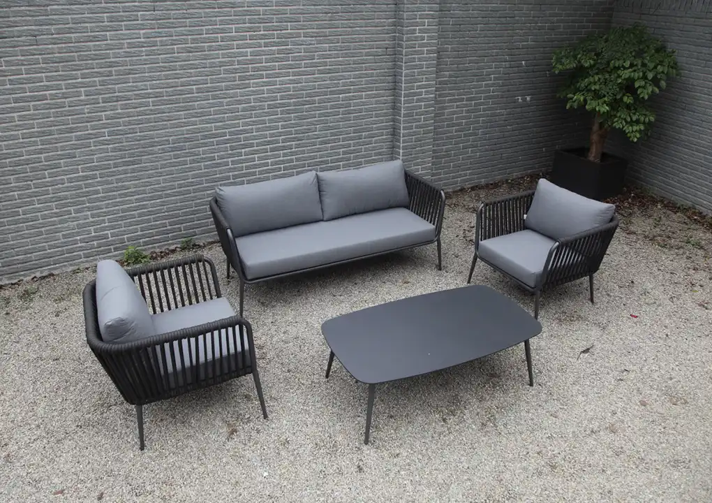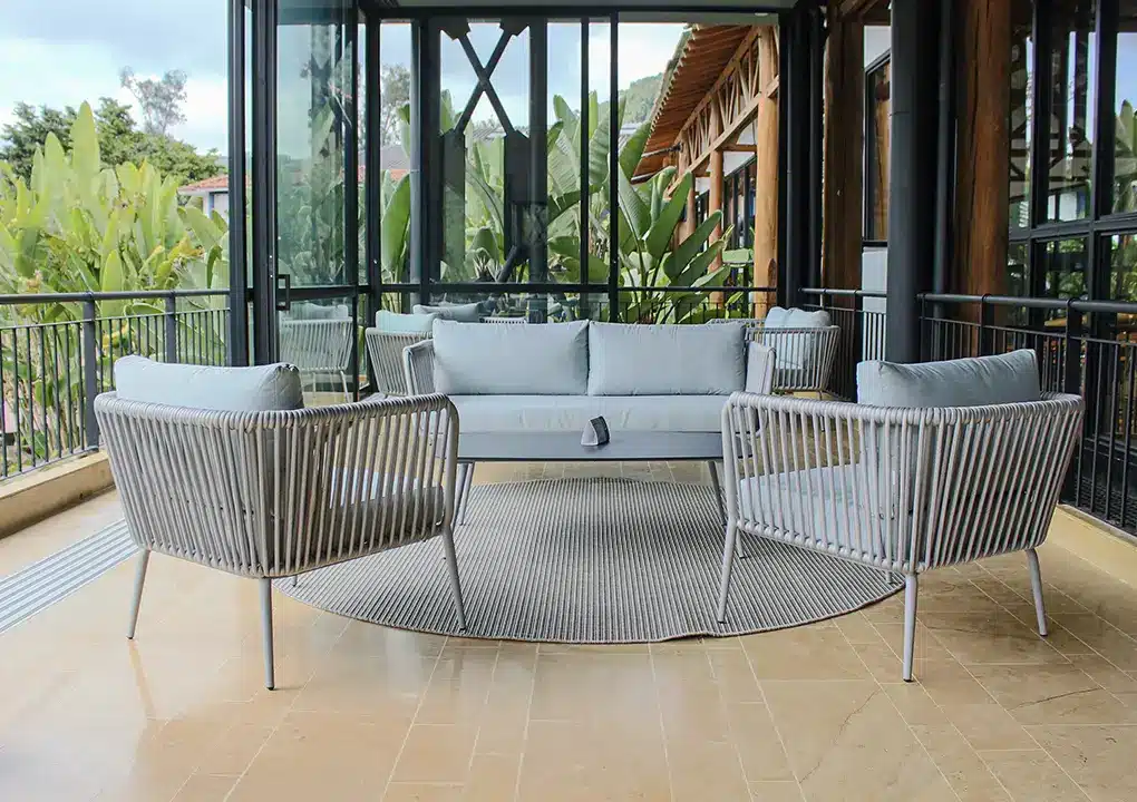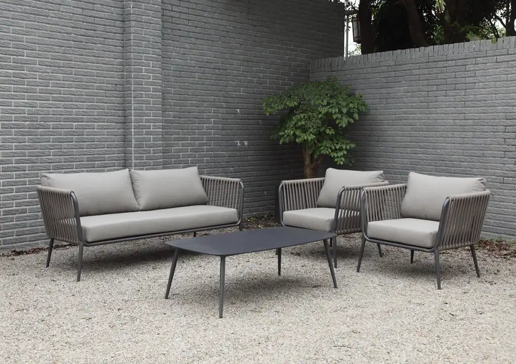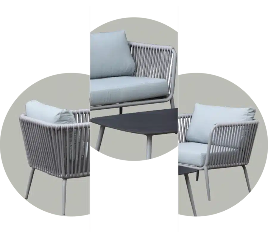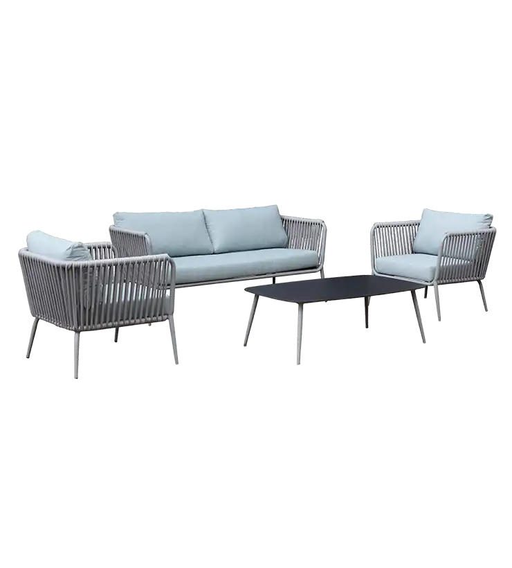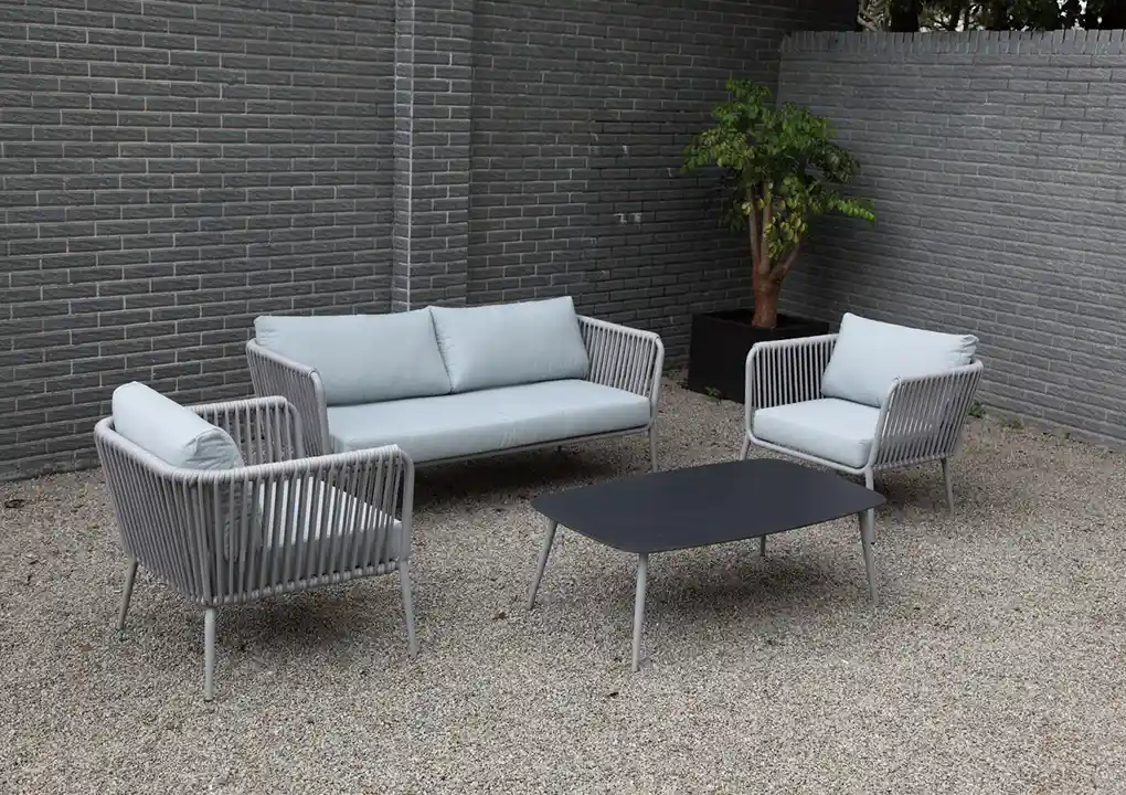 Este juego de sala es ideal para espacios exteriores, gracias a la resistencia y durabilidad de sus materiales, lo que lo convierte en una opción perfecta para terrazas. Las cuerdas de poliéster decoran el mueble de manera elegante y moderna.