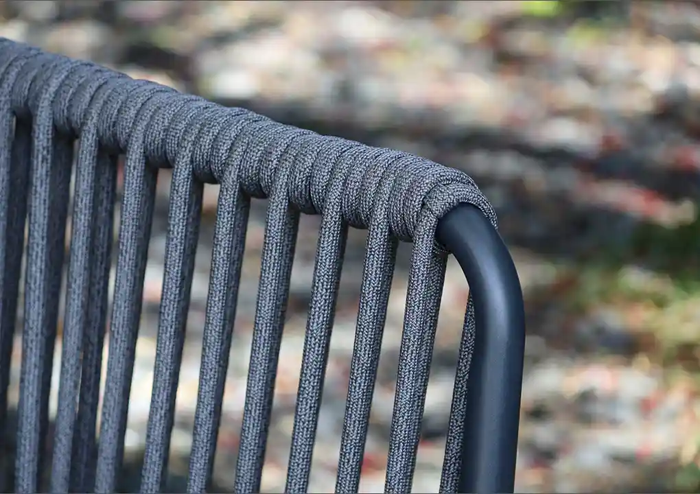 El marco de aluminio con pintura en polvo está decorado con cuerdas de poliéster teñidas en masa, garantizando una exposición al sol de hasta 5000 horas sin decolorarse. Estas cuerdas cuentan con un núcleo plástico que les proporciona resistencia y tensión.