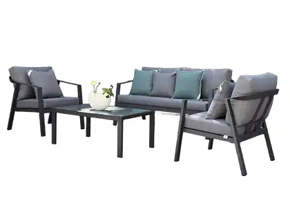 Los cojines siguen la misma línea de diseño, con texturas corrugadas que armonizan con la estructura, logrando una estética coherente y elegante. Este set está diseñado para transformar tus espacios exteriores en áreas acogedoras y sofisticadas, ideales para relajarte o compartir momentos especiales.